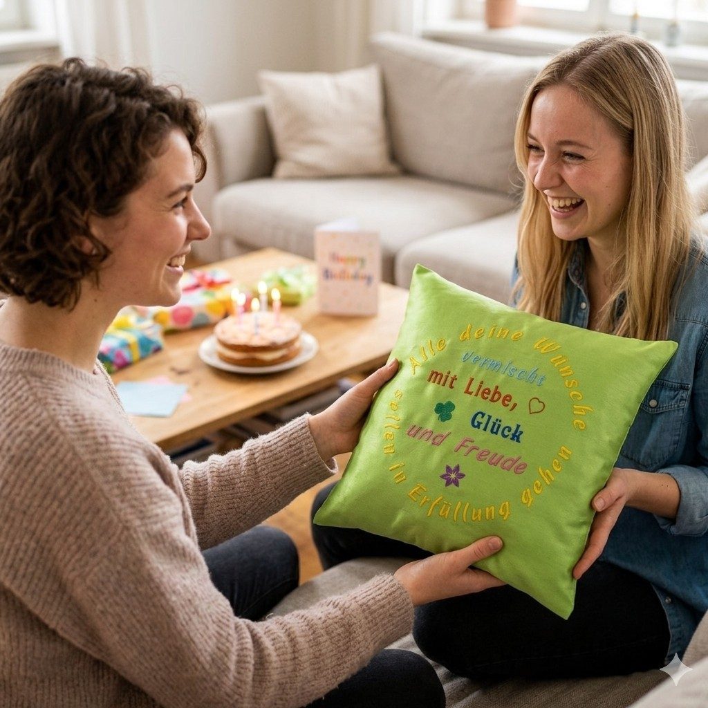 Ein Geschenk, das bleibt: Während Blumen verblühen und Pralinen aufgegessen werden, bleibt ein besticktes Kissen ein dauerhafter Begleiter. Es ist eine greifbare Erinnerung, die täglich Freude schenkt und lange Zeit geschätzt wird.